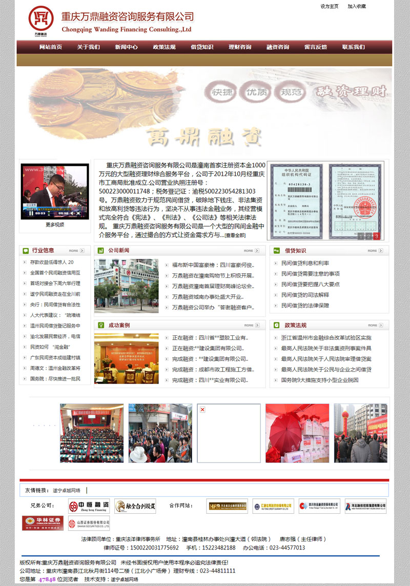 摘要:重慶萬(wàn)鼎融資咨詢(xún)服務(wù)有限公司是潼南首家注冊資本金1000萬(wàn)元的大型融資理財綜合服務(wù)平臺,公司于2012年10月經(jīng)重慶市工商局批準成立.公司營(yíng)業(yè)執照注冊號:500223000011748;稅務(wù)登記證:渝稅500223054281303號。萬(wàn)鼎融資致力于規范民間借貸,破除地下錢(qián)莊、非法集資和放高利貸等違法行為,堅決不從事違法金融業(yè)務(wù),其經(jīng)營(yíng)模式完全符合《憲法》、《刑法》、《公司法》等相關(guān)法律法規。....